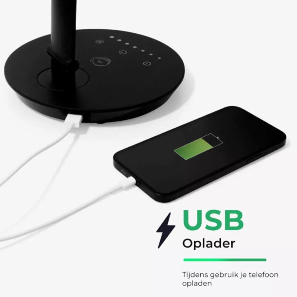 Handig: via de USB-poort aan de achterkant laad je moeiteloos je smartphone op. En met de automatische uitschakeltimer (30/60 min) vergeet je nooit meer de lamp uit te zetten.