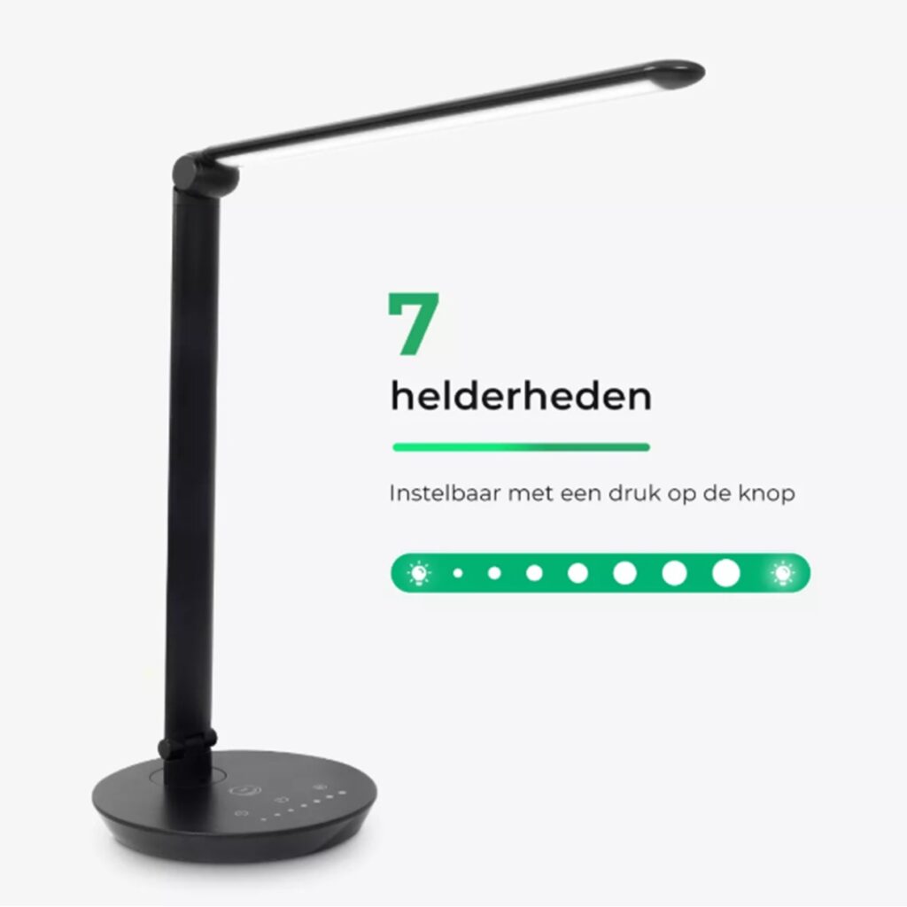 Kies uit 5 kleurtemperaturen (3000K–6000K) en 7 helderheidsniveaus, eenvoudig in te stellen via de touchbediening. Dankzij de geheugenfunctie onthoudt de lamp je laatste instellingen.