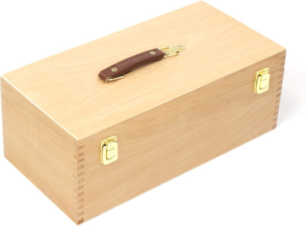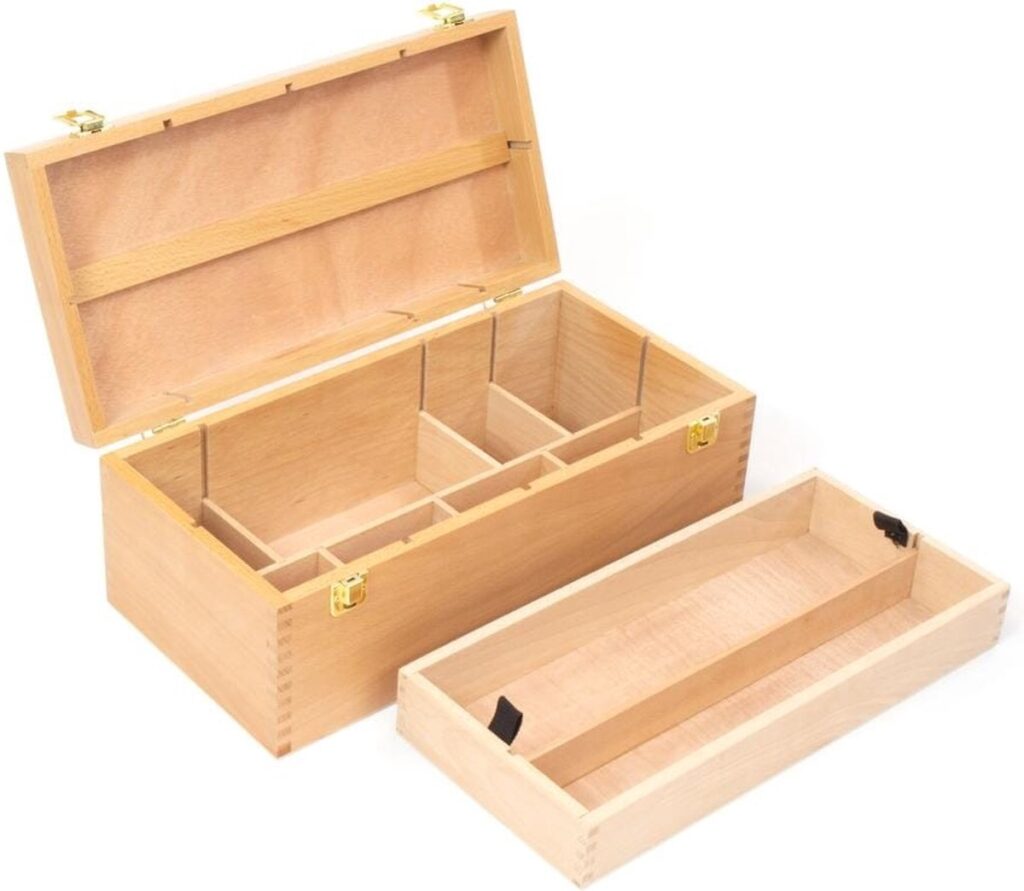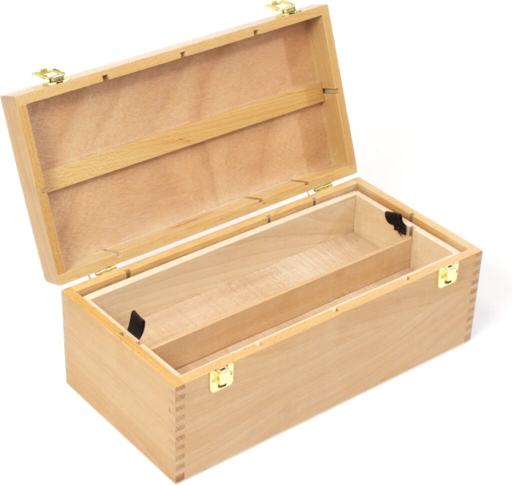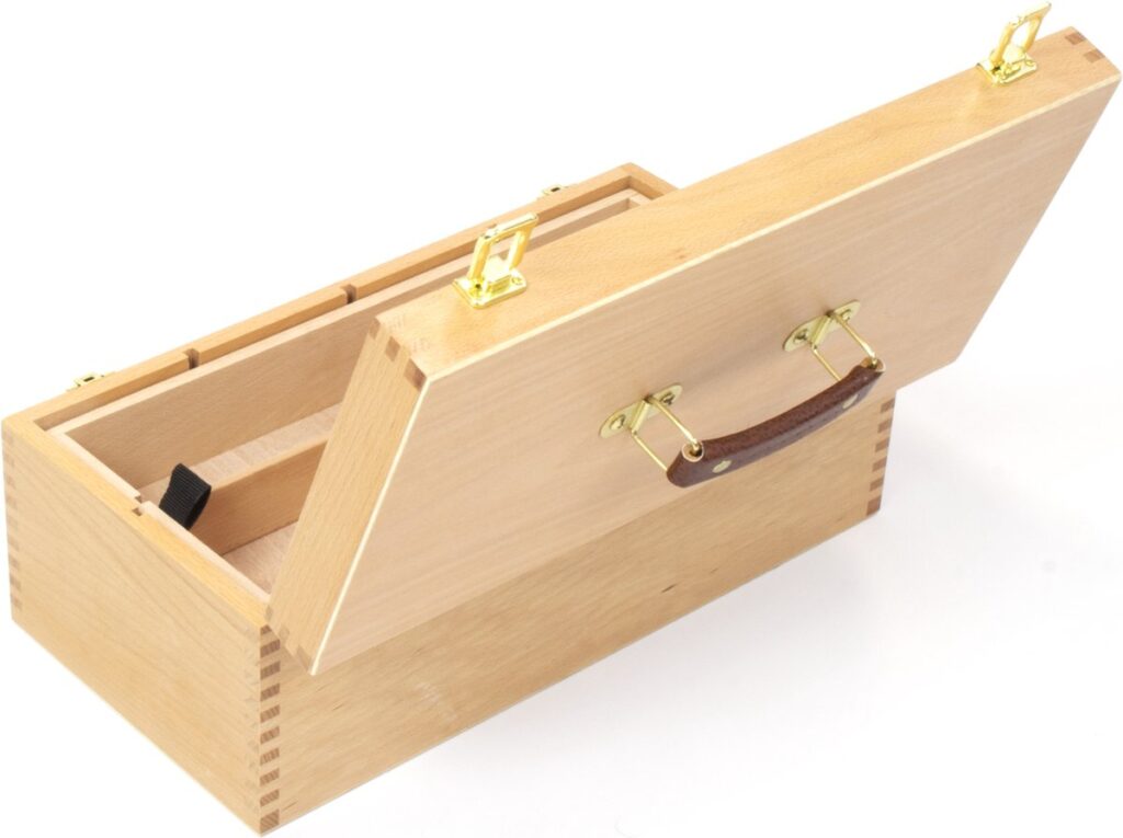 Mooi afgewerkte beukenhouten schilderskist met inzetbak en vakverdeling. Formaat 40×19.5×15.5cm. Voorzien van handvat en afsluitbaar met goudkleurige sluitingen. Vakverdeling kist is naar eigen inzicht in te delen. Binnenmaat 36×15.5x5cm. Het hout is afgewerkt met een water gedragen lak ter bescherming.