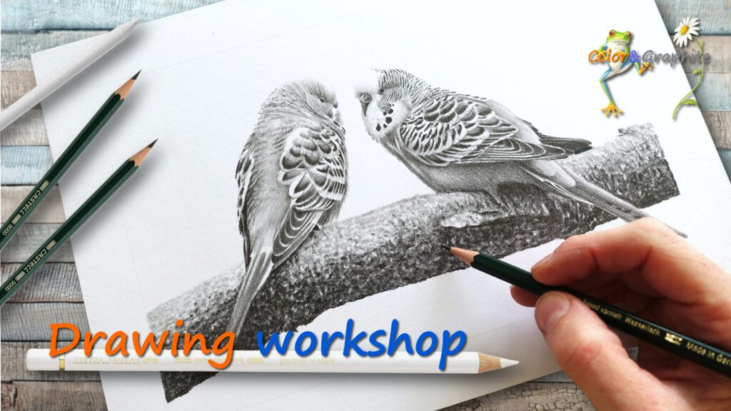 - Tekenvel (Tekenpapier van Clairefontaine 180 grams, kleur wit, 21×29,7 cm) met daarop de lijntekening van de te tekenen afbeelding. Dit zijn heel licht grijze lijnen, welke je niet meer zult zien zodra de tekening af is. Overtrekken/natekenen is dus niet nodig.