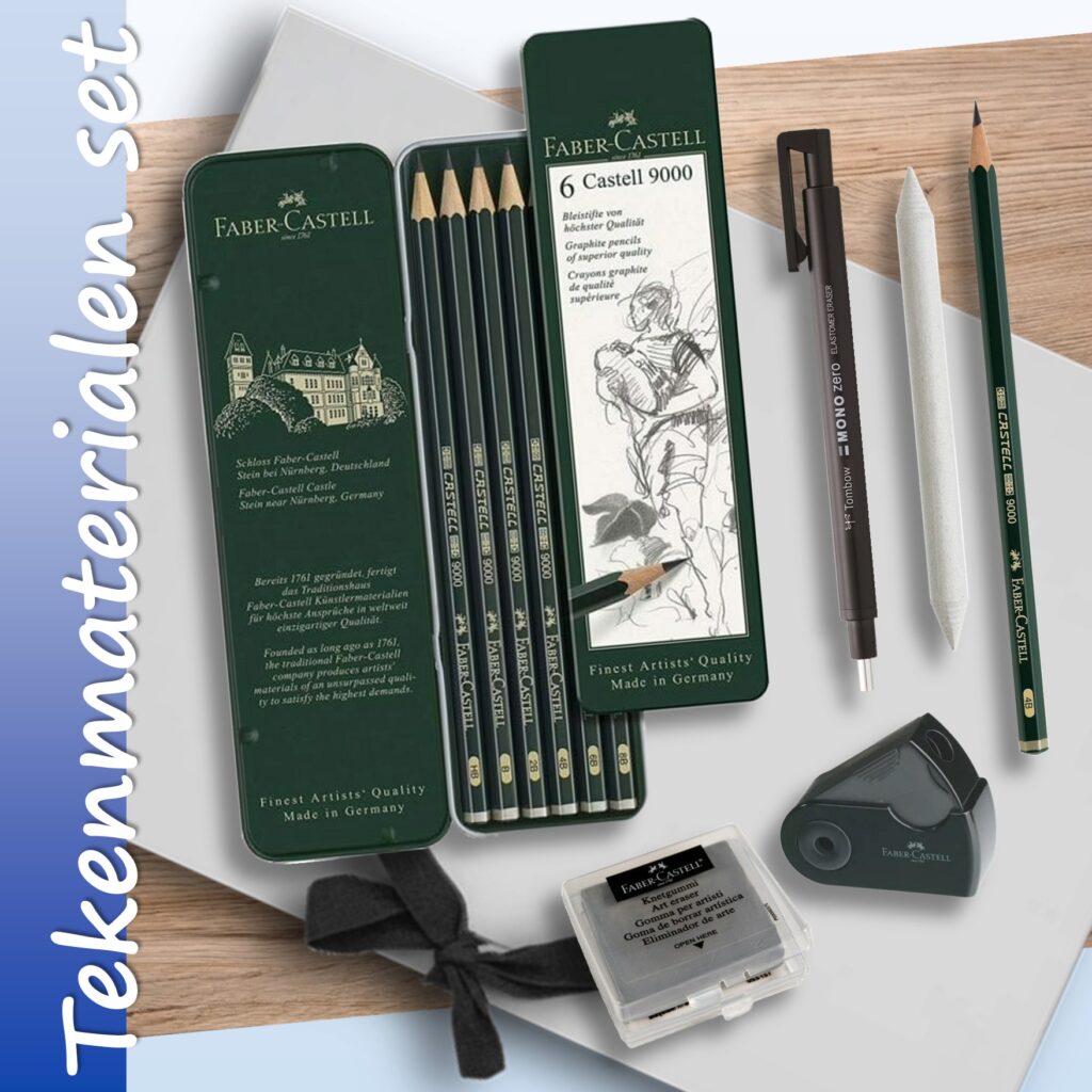 - blik met 6 grafietpotloden van Faber Castell 9000, met hardheden: HB, B, 2B, 4B. 6B en 8B