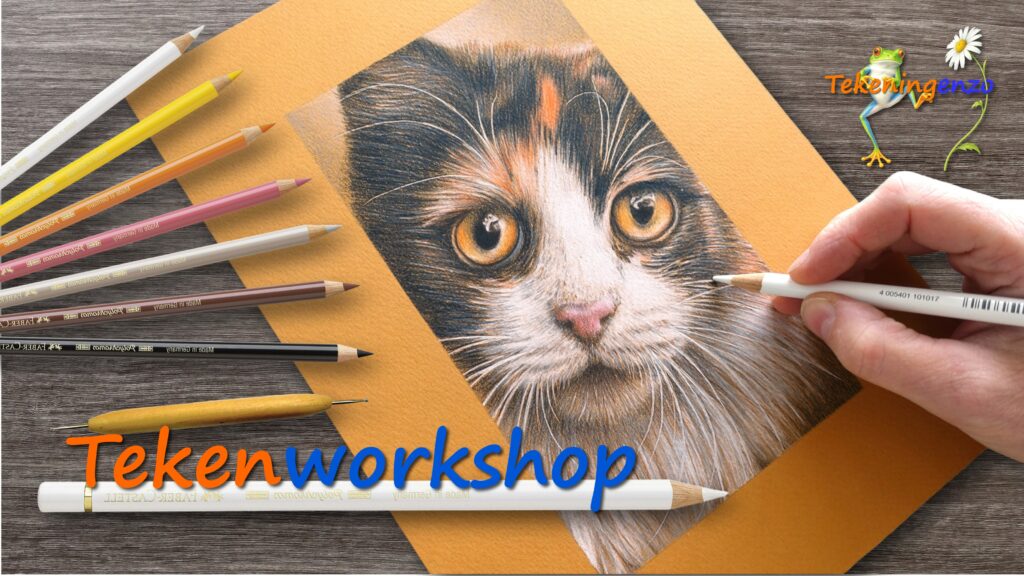 - Twee tekenvellen (A4 formaat) met daarop de lijntekening van de te tekenen afbeelding. Dit zijn heel licht grijze lijnen, welke je niet of nauwelijks meer zult zien zodra de tekening af is. Overtrekken/natekenen is dus niet nodig. Eén vel is om te oefenen, de ander is ‘het net’. Papiertype: 180 grams donker oker tekenpapier van Fabriano.